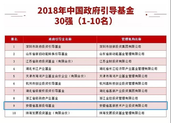 7月11日上午,清科集团在“第十三届中国基金合伙人峰会”上发布了备受瞩目的清科“2018年中国政府引导基金30强”。安徽省高新投母基金首次参评即获中国政府引导基金排名第九名,体现了资本市场的高度认可,以及其在全国基金行业中的重要地位。