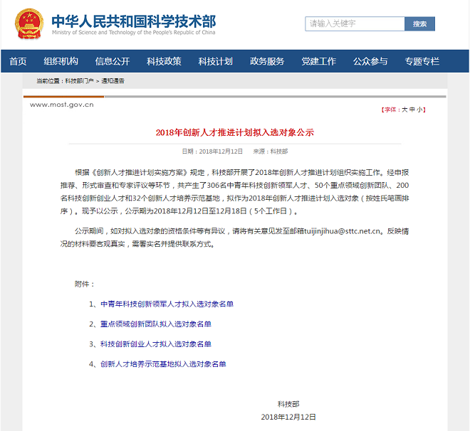 12月12日,国家科技部公示了2018年创新人才推进计划入选对象名单,入选名单包含306名国家中青年科技创新领军人才、50个国家重点领域创新团队、200名国家科技创新创业人才和32个国家创新人才培养示范基地。安徽省高新投招引团队项目多人入选:安徽中科美络吴仲城、安徽酷哇机器人何弢、芜湖森思泰克秦屹入选科技创新创业人才拟入选对象名单,合肥中科普瑞昇刘青松入选中青年科技创新领军人才拟入选对象名单。