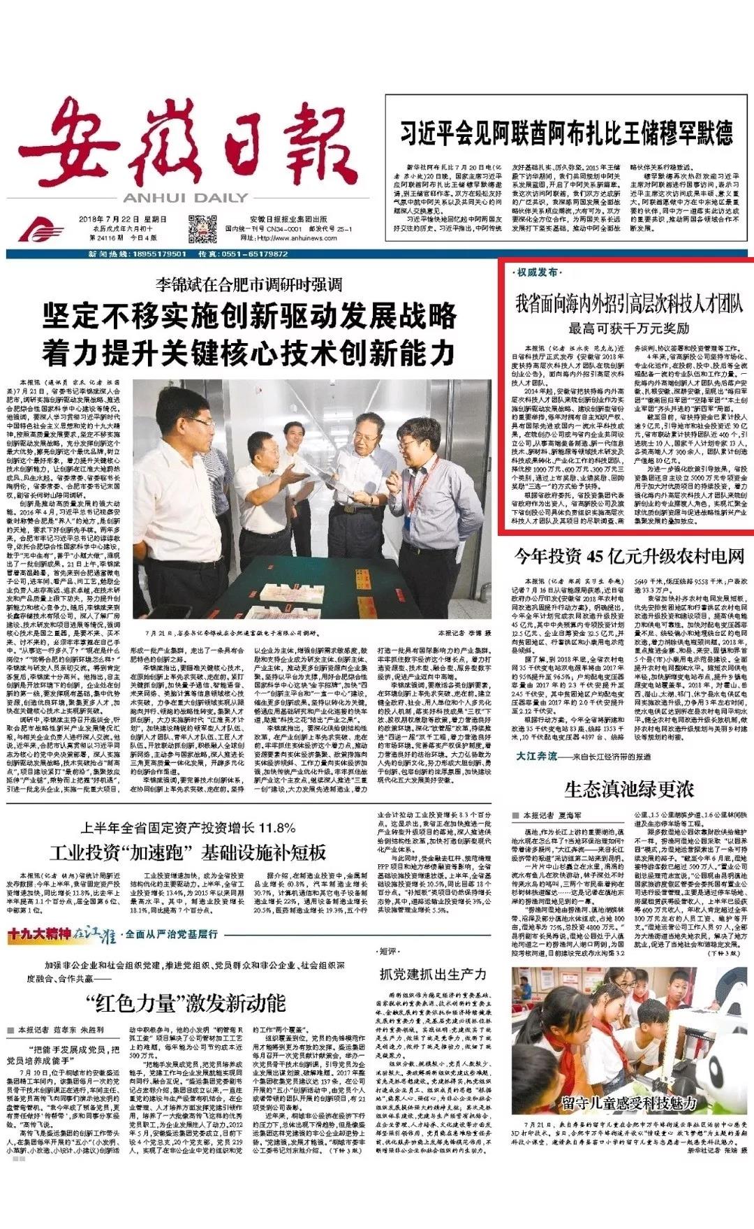 7月22日的《安徽日报》头版刊发题为《我省面向海内外招引高层次科技人才团队——最高可获千万元奖励》的新闻通讯,深度报道省投资集团、省拼搏在线(中国)唯一官方网站招引团队工作。