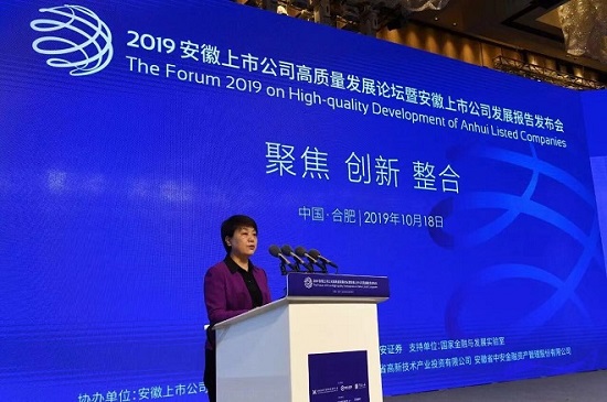 10月18日,2019安徽上市公司高质量发展论坛暨安徽上市公司报告发布会在合肥成功举办。省政府副省长、省工商联主席王翠凤出席论坛并致辞,中国建材集团董事长、中国上市公司协会会长宋志平致辞并作主旨演讲,国家金融与发展实验室理事长李扬,省投资集团董事长,安徽证监局局长叶锦伟,安徽省国资委副主任项小龙,安徽省地方金融监管局副局长戴利强,深圳证券交易所副总经理李鸣钟,安徽华米信息科技有限公司创始人、董事长兼CEO黄汪,基石资本董事长张维等出席论坛。
