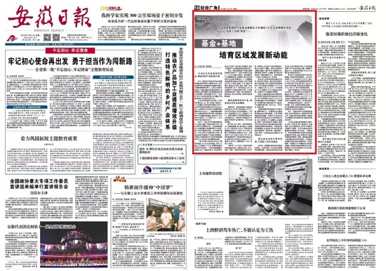 9月9日,《安徽日报》10版刊发题为《基金+基地 培育区域发展新动能》的报道,长篇深度报道省拼搏在线(中国)唯一官方网站“基金+基地”工作成效。