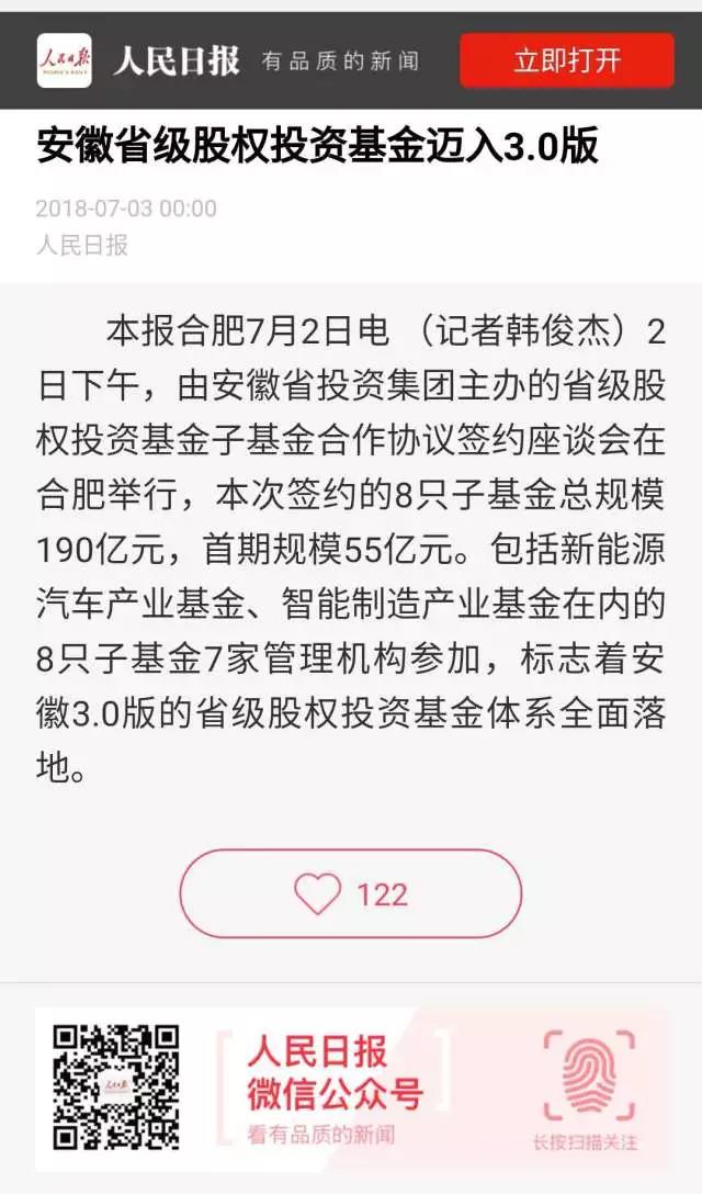 7月3日的《人民日报》第10版刊发题为《安徽省级股权投资基金迈入3.0版》的新闻报道,这是省拼搏在线(中国)唯一官方网站工作第一次登上人民日报。