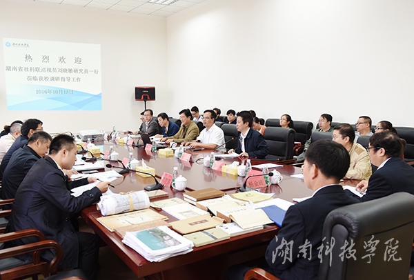 本网讯(记者 代天 摄影 何帅文)10月13日上午,湖南省社科联巡视员刘晓敏研究员一行来校调研。校党委书记陈弘主持,校长曾宝成,副校长宋宏福,副校级督导、工会主席陈仲庚出席。