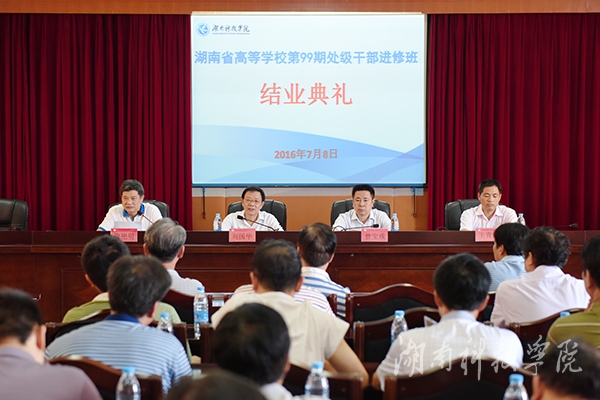 本网讯 7月8日下午,湖南省高等学校第99期处级干部进修班暨我校2016年处级干部培训班结业典礼在行政办公楼八楼一会议室举行。省高校干部培训中心书记、省教育工委党校副校长刘国华,省高校干部培训中心、省教育工委党校教务部主任王青沅,学校党委副书记、校长曾宝成出席结业典礼。典礼由我校党委副书记、党校校长唐艳明主持。