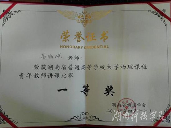 本网讯(通讯员 谢娟)近日,湖南省物理学会传来喜讯,理学院高海峡老师荣获湖南省高等学校大学物理课程青年教师讲课比赛一等奖。