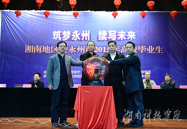 湖南省人力资源和社会保障厅巡视员曾坤,湖南省人力资源服务中心副主任戴小兵,湖南省大中专学校学生信息咨询与就业指导中心副主任钟秋明,永州市委常委、常务副市长唐湘林,永州市人大副主任郑柏顺,永州市政协副主席唐运军,永州市委组织部副部长、市人力资源和社会保障局党组书记、局长唐树成,我校党委书记陈弘、校长曾宝成、党委副书记唐艳明、副校长李常健、吴小林、程智开等出席。开幕式由程智开主持。