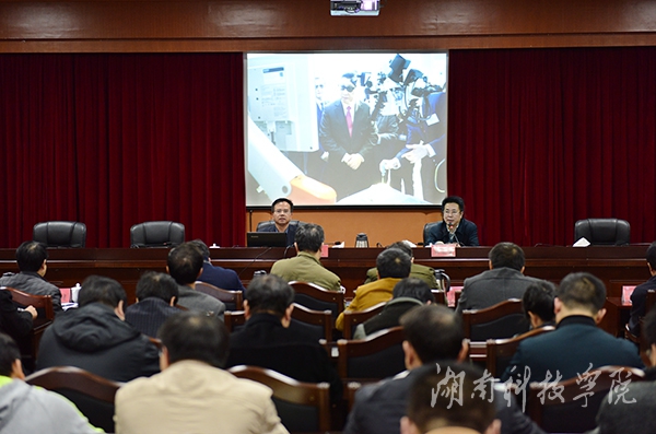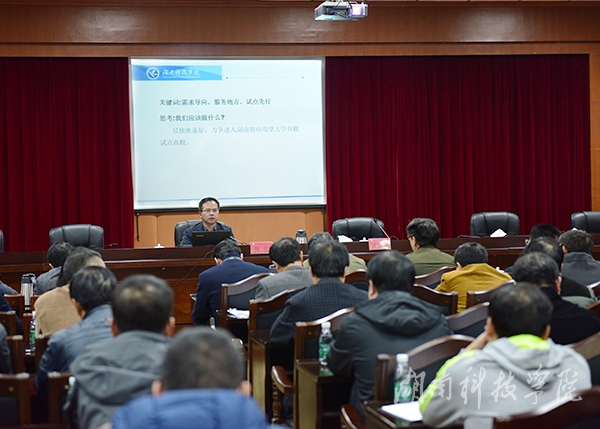 本网讯(记者 吴亚 实习记者 杨光月 曾霏霏)11月17日晚,学校召集全体中层干部在行政办公楼八楼一会议室召开转型发展学习动员大会。校党委书记陈弘作题为“国家引导地方高校向应用型转变指导意见解读以及我们面临的形势任务”的专题辅导报告。校长曾宝成主持,在家校领导唐艳明、宋宏福、彭立威、郑山明、李常健、吴小林、程智开、袁先友等出席报告会。“随着经济发展进入新常态,经济社会发展不断推进特别是创新驱动发展战略的实施,要求我们必须要适应新常态,展现新作为。”陈弘深刻分析了当前转型发展面临的新形势和新任务,“新形势下,我们应该做什么?”陈弘指出,要认真学习领会党的十八届五中全会精神和教育部、国家发改委、财政部发布的《关于引导部分地方普通本科高校向应用型转变的指导意见》(以下简称《指导意见》),要学习、领会经济发展新常态、产业转型升级、创新驱动发展等国家重大战略的精神实质,将办学思路、办学方向、办学定位进一步调整到更加符合“四个转到”的要求上来,通过调整学科、改造专业、创新课程、改革人才培养模式,以适应新常态经济和创新驱动战略对于人才和科技支撑的迫切需求。