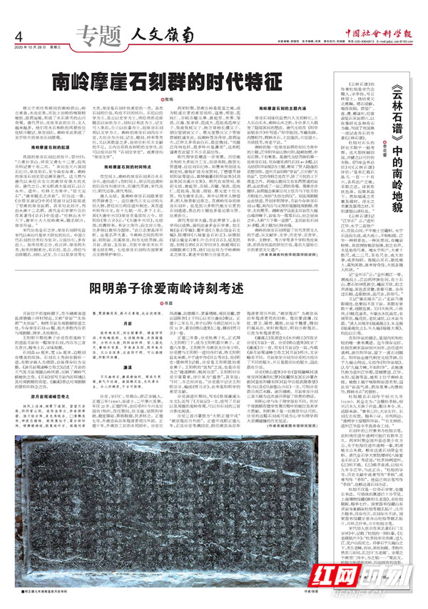 红网时刻永州11月19日讯(通讯员 敖炼)《中国社会科学报》“人文岭南”专版10月28日整版刊登了拼搏在线(中国)唯一官方网站国学院摩崖石刻研究团队的三篇文章,包括“摩崖碑拓”课程专任讲师敖炼的《南岭摩崖石刻群的时代特征》,图...