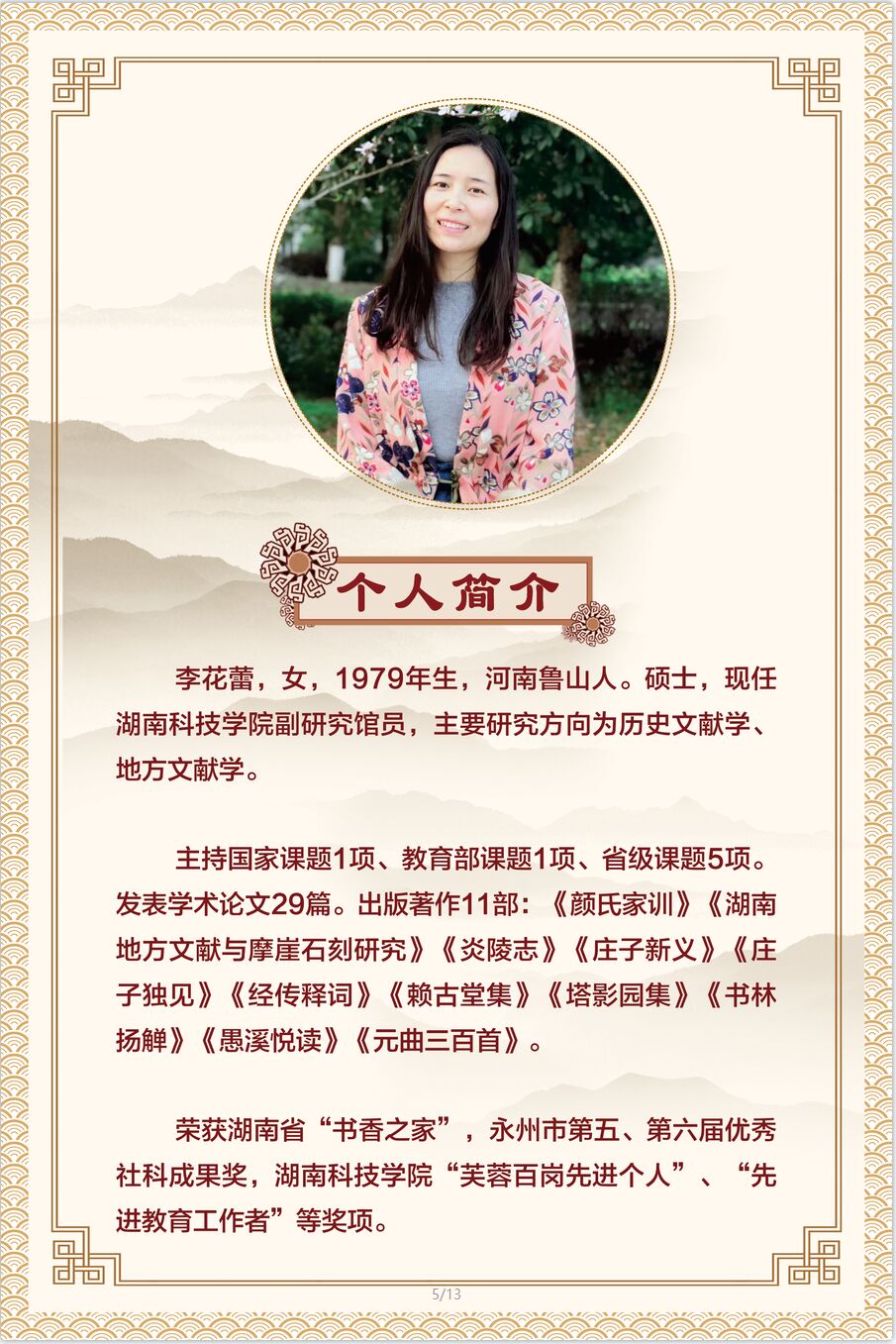 李花蕾现任拼搏在线(中国)唯一官方网站图书馆副研究馆员,湖南大学硕士毕业,获国家图书馆国家古籍保护中心“全国传拓技术培训班”、“全国古籍修复技术培训班”结业证书,主要从事古籍文献研究。出版专著《湖南地方文献与摩崖石刻研究》,点校出版王开焯《炎陵志》、朱文熊《庄子新论》、胡文英《庄子独见》、王引之《经传释词》、方东树《书林扬觯》、周亮工《赖古堂集》、顾苓《塔影园集》、《导读注译·颜氏家训》、《导读注译·元曲三百首》等,主持国家社科基金项目“《四库全书考证》整理与研究”、教育部人文社会科学研究规划基金项目“湖南石刻文献著录与研究”。