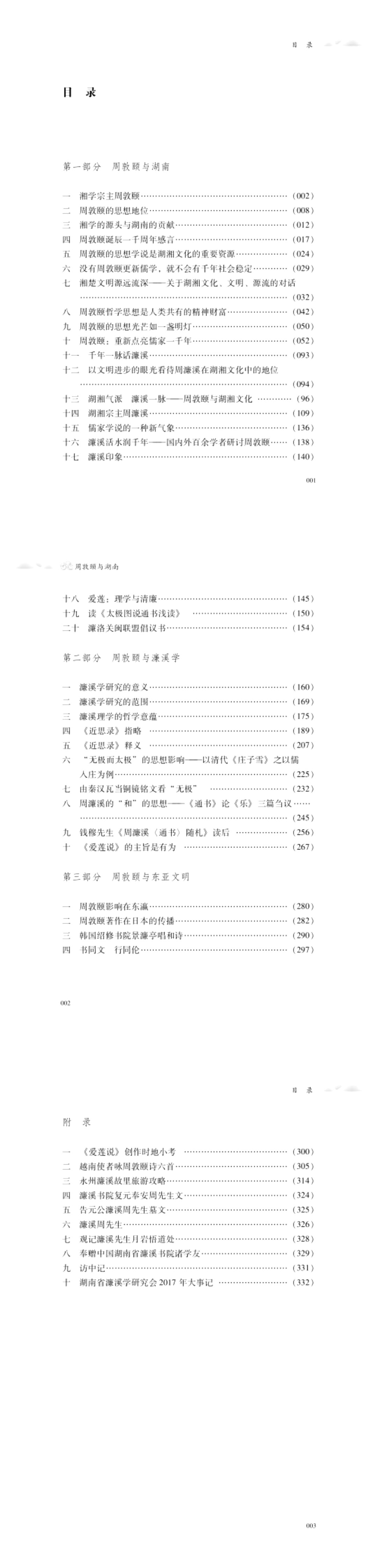 文章多数已在报刊公开发表,如《周敦颐哲学思想是人类共有的精神财富》,《湖南日报》2017年4月20日发表;《周敦颐的思想地位》,《中华读书报》2014年8月20日发表;《湘学宗主周敦颐》,《中华读书报》2017年5月3日发表;《周敦颐不是唯心主义哲学家》,《中华读书报》2018年10月24日发表;《没有周敦颐更新儒学,就不会有千年社会稳定》,《湘声报》2017年5月30日发表;《周敦颐著作在日本的传播》,《图书馆》2016年第9期发表。本书对于周敦颐的历史地位给予了充分的肯定,对于濂溪理学相关学术问题多有进一步的拓深理解。鉴于周敦颐与湖南的关系问题、周敦颐理学思想的认识问题尚有不少未到之处,作者表达了热情的倡导和呼吁。