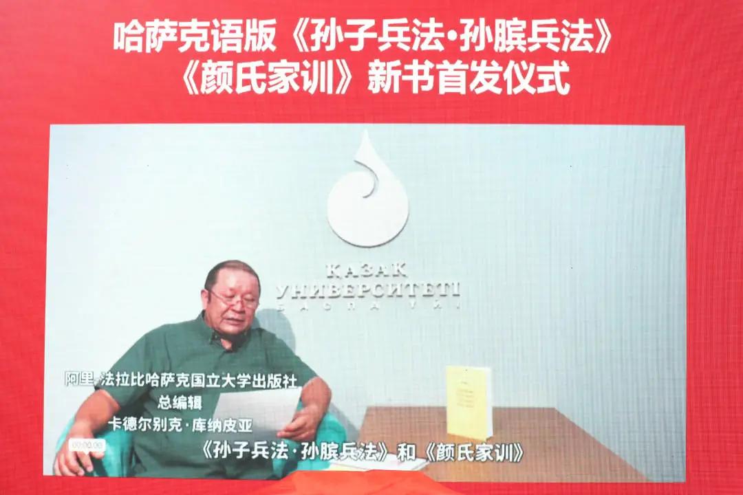 哈萨克斯坦阿里-法拉比哈萨克国立大学出版社总编辑卡德尔别克·库纳皮亚通过视频的方式发来贺信。他说道,哈萨克语版《颜氏家训》在当地出版发行后,这部内容博大精深、有着丰富文化内涵的经典必定会受到哈萨克斯坦读者的热烈欢迎。他还表示:“《颜氏家训》在哈萨克斯坦的正式出版必定会在中哈文化交流史上搭起一座桥梁。”