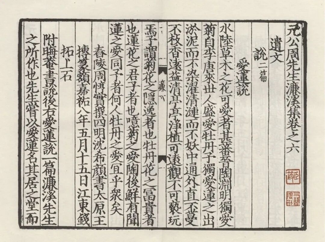 1063年,北宋仁宗嘉祐八年的五月十五日,周敦颐在虔州雩都,今江西赣州的罗岩,刻下了《爱莲说》,并由“四明沈希颜书,太原王搏篆额,江东钱拓上石”。