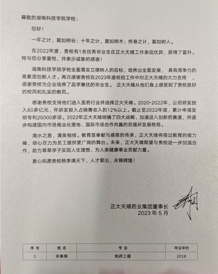 (本网讯 刘乐)近日,我院收到来自用人单位正大天晴药业集团的喜报,我院制药工程2018届毕业生宋高银同学在正大天晴工作表现优异,获得晋升。信中对我校人才培养、社会声誉给予高度赞扬,并期待日后能与学校进一步加强校企合作,共同培育无愧于时代和人民的杰出人才。