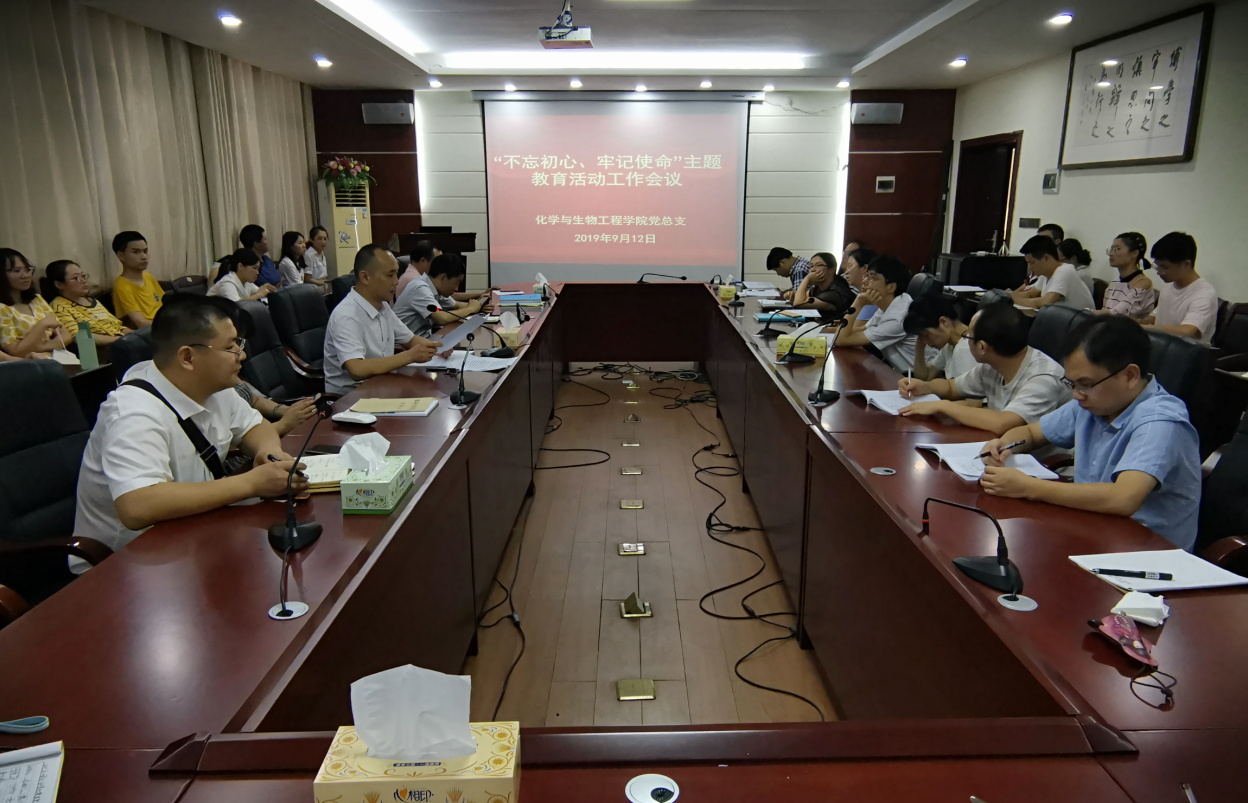 9月12日,化学与生物工程学院党总支在逸夫楼320室召开“不忘初心、牢记使命”主题教育活动工作会议,党总支书记曾二青主持会议,全体师生党员参加。