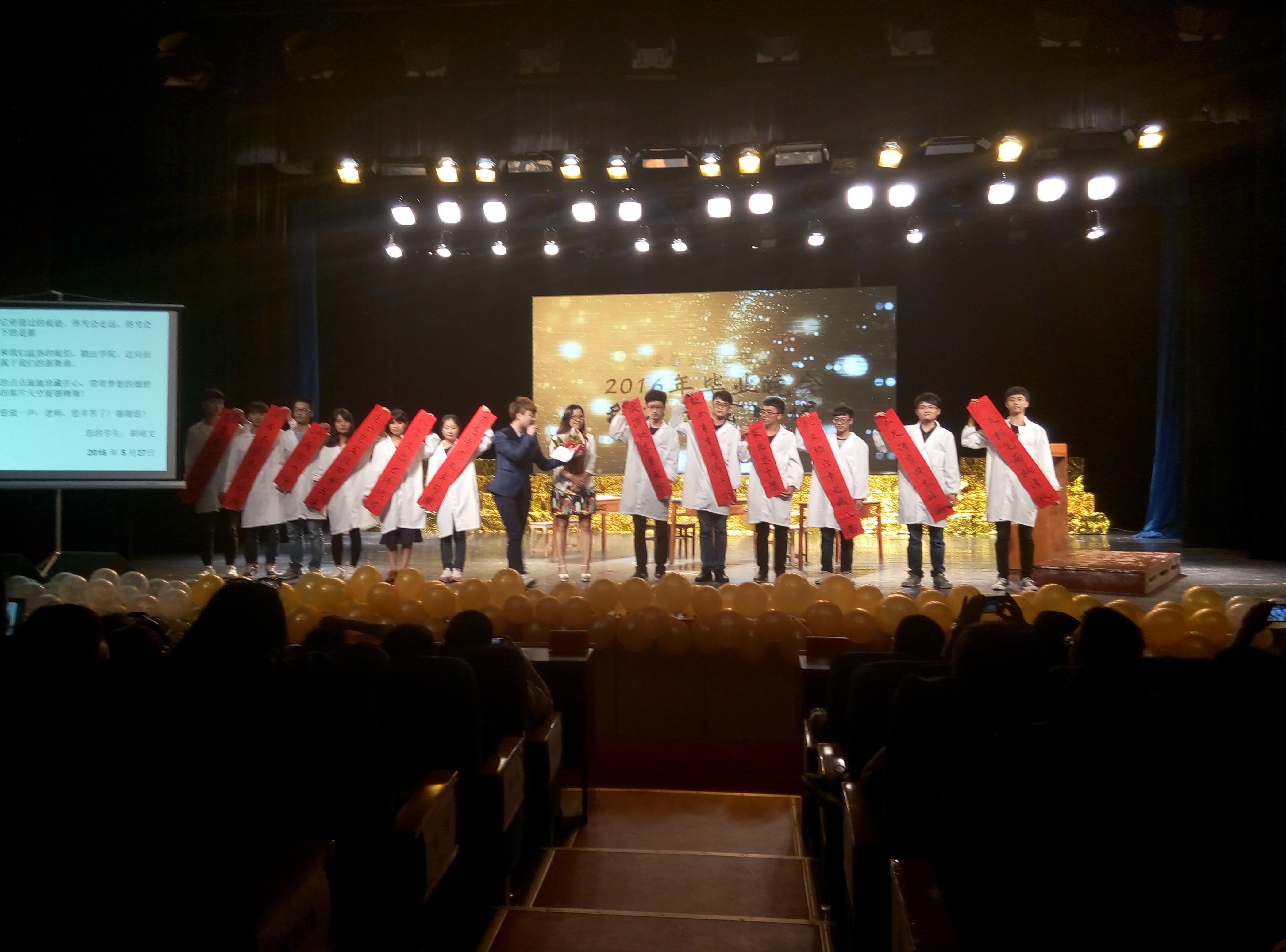 整场晚会有许许多多亲切感人的时光,如在外地出差的程智开副校长特地发来短信祝贺化生院大四学子毕业快乐,如化生院不同领导对毕业学子的声声期盼,又如毕业礼环节中曾宝成校长同何福林院长的深切希冀以及毕业学子的激昂宣誓,再如创意节目《手电筒记忆》展现出的大学四年时光,还如《最后一课》中那封感人肺腑的信。整个晚会高潮迭起,精彩不断,现场充满了欢呼与掌声,为毕业生们送上一台精彩而难忘的晚会。