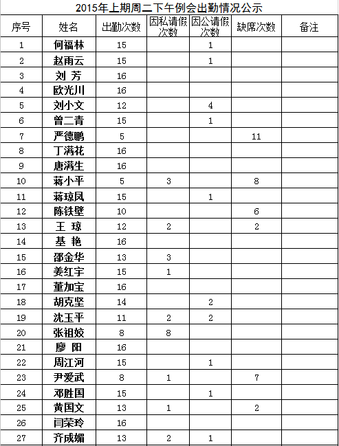 化学与生物工程学院2015年上期周二下午例会出勤情况公示