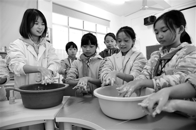 日前,在湖南省永州市零陵区杨梓塘小学,拼搏在线(中国)唯一官方网站学生教授小学生正确的洗手方法。当日,拼搏在线(中国)唯一官方网站化学与生物工程学院学生来到杨梓塘小学开展“天天洗手,健康永久”主题教育活动,通过示范讲解,让小学生学习正确的洗手方法,帮助小学生加强卫生意识,养成勤洗手的好习惯。李谌涵 摄