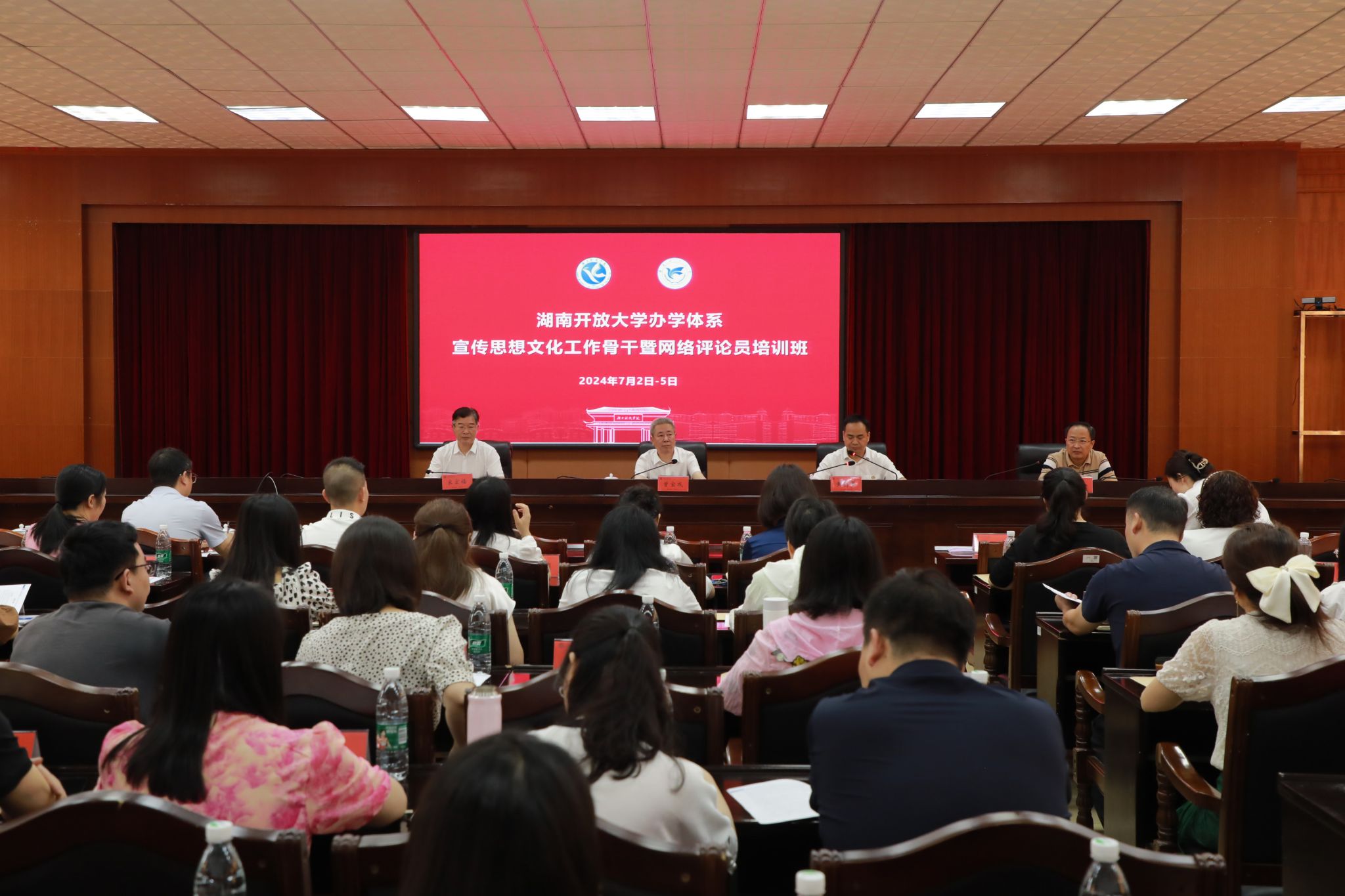 本网讯(通讯员 熊玲芝) 为深入学习贯彻习近平总书记对宣传思想文化工作的重要指示精神和全国宣传思想文化工作会议精神,着力打造一支政治过硬、本领高强、求实创新、能打胜仗的宣传思想工作队伍,7月3日上午,湖南开放大学办学体系宣传思想文化骨干暨网络评论员培训班在我校开班。湖南开放大学党委书记曾宝成,我校党委副书记、校长黄创霞,湖南开放大学党委副书记欧俊、党委委员、组织部长王宇出席开班式。开班式由我校党委副书记宋宏福主持。