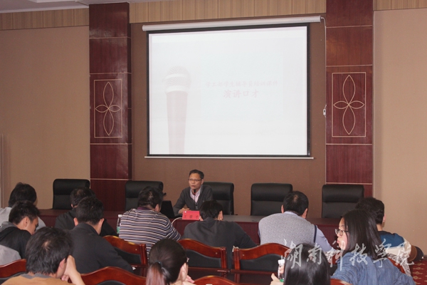 本网讯(通讯员 罗晶 黎露琼)4月20日下午,学工部在行政楼八楼会议室开展辅导员职业能力专项培训。经济与管理学院王豪才副教授应邀作题为“即兴演讲与主题演讲”的讲座。学工部相关领导、各学院学生工作负责人及全体辅导员参加此次培训。
