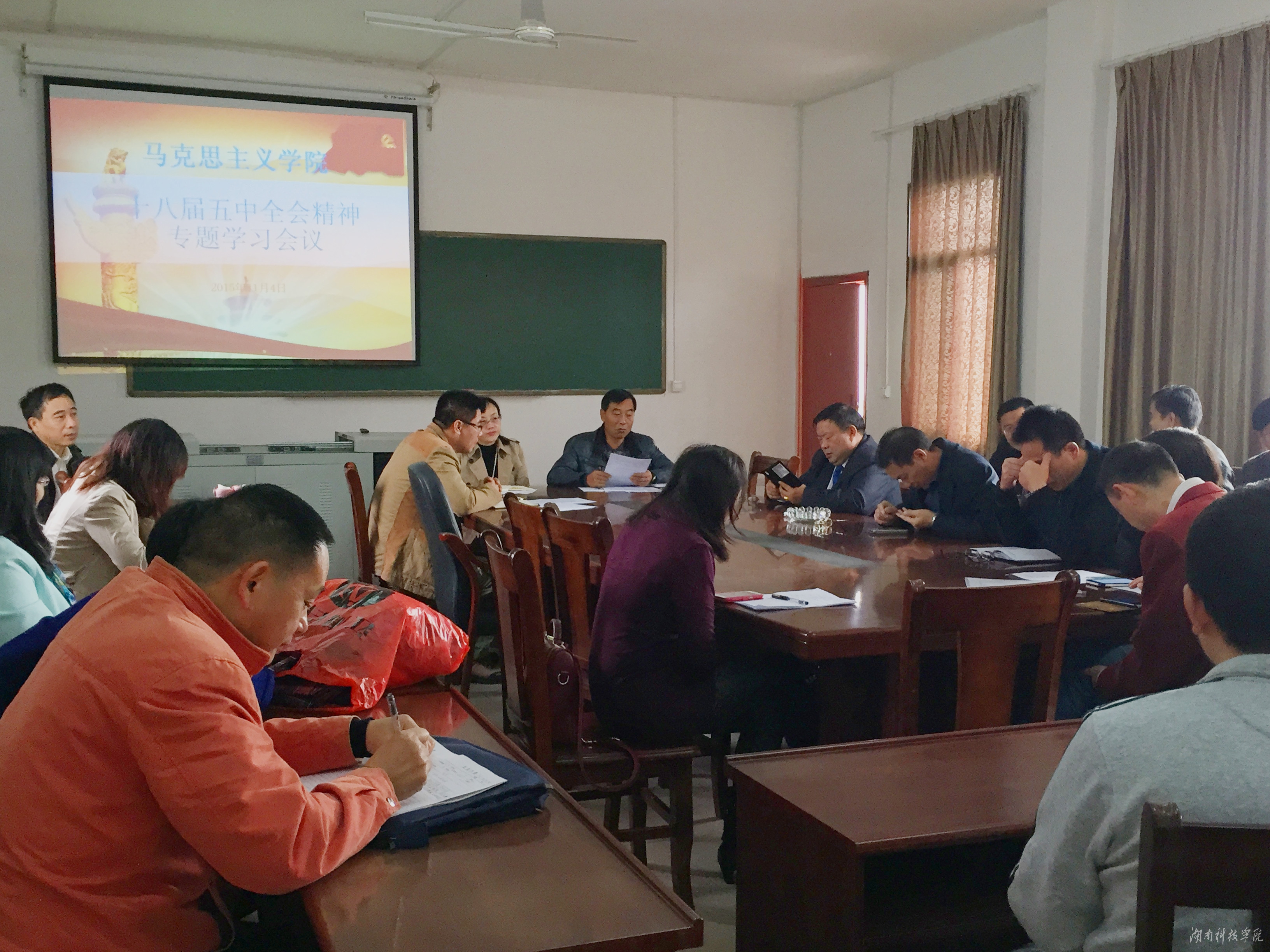 本网讯 (通讯员  李艳)11月4日上午,马克思主义学院组织全体教职员工集中学习党的十八届五中全会精神,会议认真学习了中国共产党第十八届中央委员会第五次全体会议公报。会议由该院党总支书记唐森树主持。