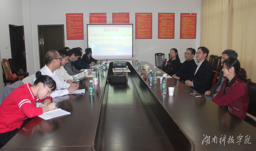 本网讯(通讯员 廖群峰)10月20日下午,中南林业科技大学土木工程与力学学院党委书记尹健、发展规划与学科建设处处长肖宏彬一行5人来院考察交流。校发展规划与学科建设处处长潘剑锋,土环学院党总支书记张俭民、副院长周基热情接待。