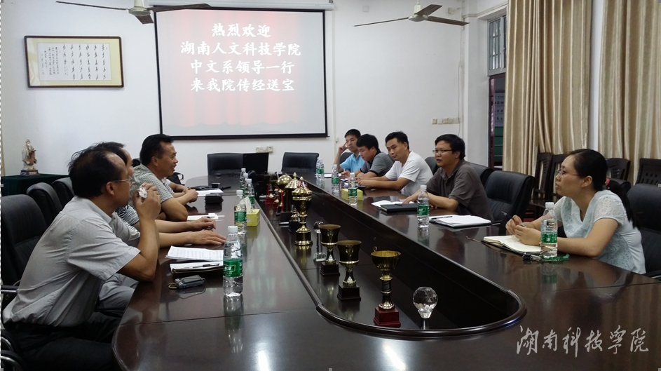 湖南人文科技学院中国语言文学系设有汉语言文学、秘书学二个本科专业,与我校人文院中文系、秘书学系设立的汉语言文学、秘书学专业一致。交流中,双方介绍了各自的办学经验、专业建设、师资队伍建设等相关情况。重点探讨了在同类院校中中国语言文学类专业如何转型发展,及如何制定好地方院校二级院系“十三五”事业发展规划等问题。