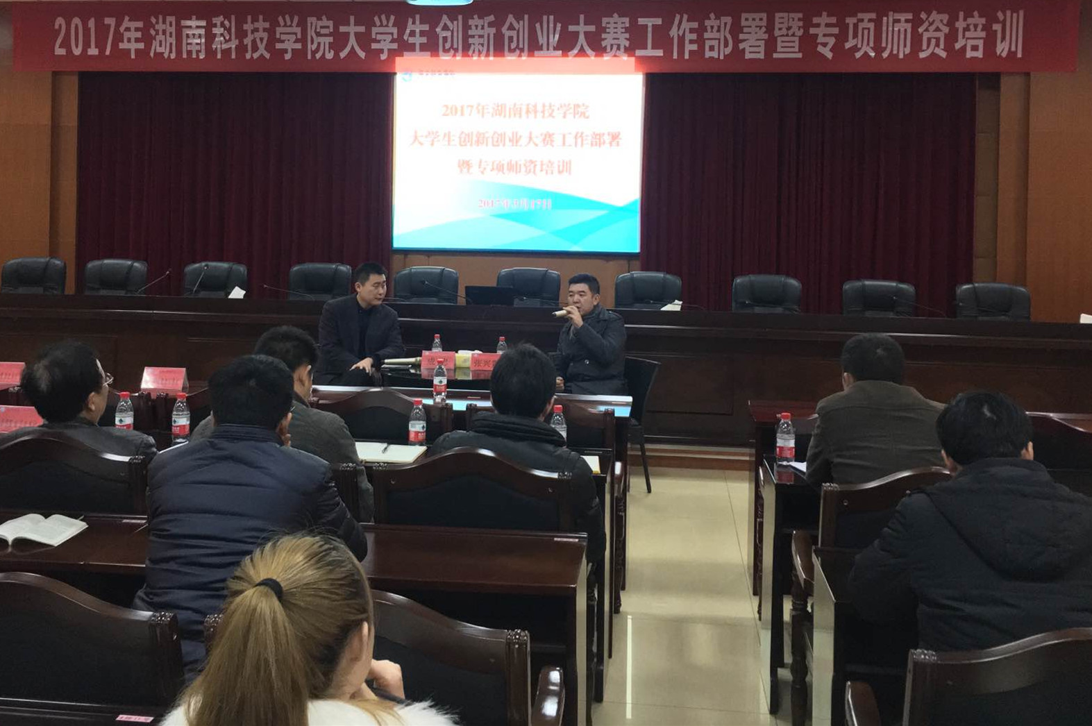本网讯 317日,学校举办“大学生创新创业大赛专项培训班”。湖南凹凸人互联科技有限公司总经理成忠、三一众创孵化器有限公司(国家级众创空间)常务副总经理张兴霖应邀来校担任主讲嘉宾。