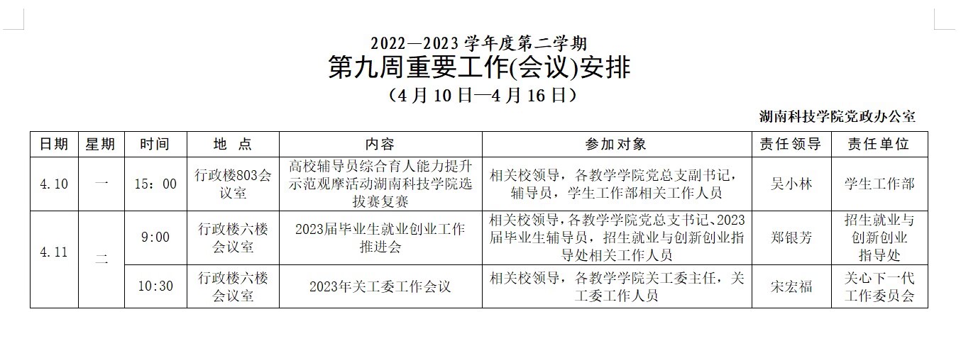 [党政办]第九周重要工作(会议)安排(4月10日—4月16日)