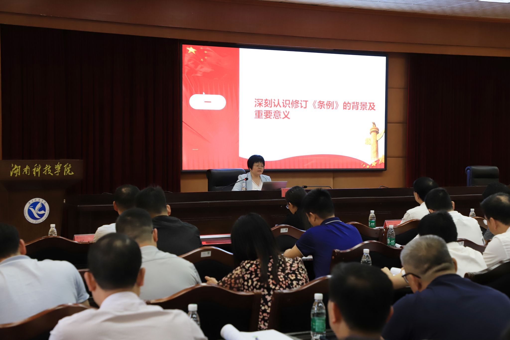 报告会邀请永州市纪委监委案件审理室主任刘颖对新修订的《中国共产党纪律处分条例》(以下简称《条例》)作辅导解读。刘颖以“全面加强党的纪律建设 推进全面从严治党向纵深发展”为题,从“深刻认识修订《条例》的背景及重要意义”“准确把握《条例》修订的主要特色及内容”“党纪政务处分的后果”等三个方面,对《条例》做了深刻、系统、全面的解读,具有很强的理论性、指导性和实践性。