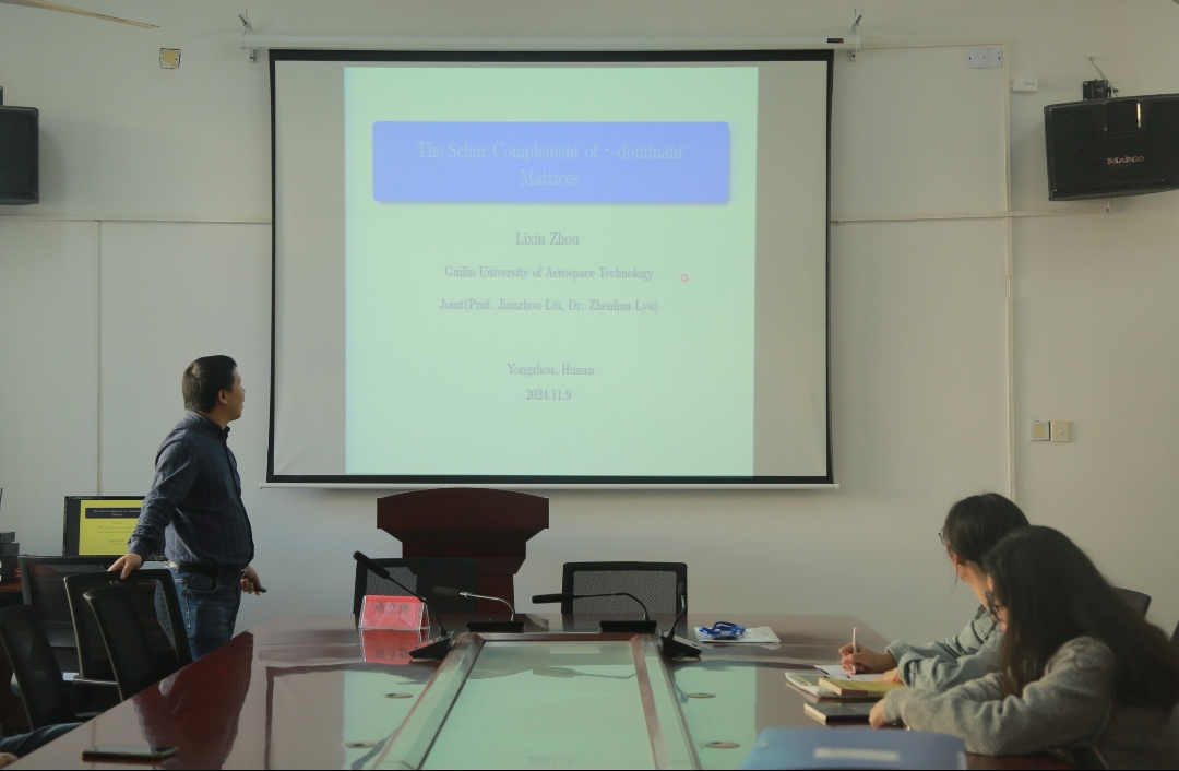 本网讯(通讯员:石庆湘)为了探讨数值代数理论的发展前沿,11月9日上午,理学院在明理楼313举行了以“γ占优矩阵的Schur补”为主题的讲座。讲座由桂林航空工业学院周立新教授主讲,理学院副院长周立平、理学院部分老师学生出席。