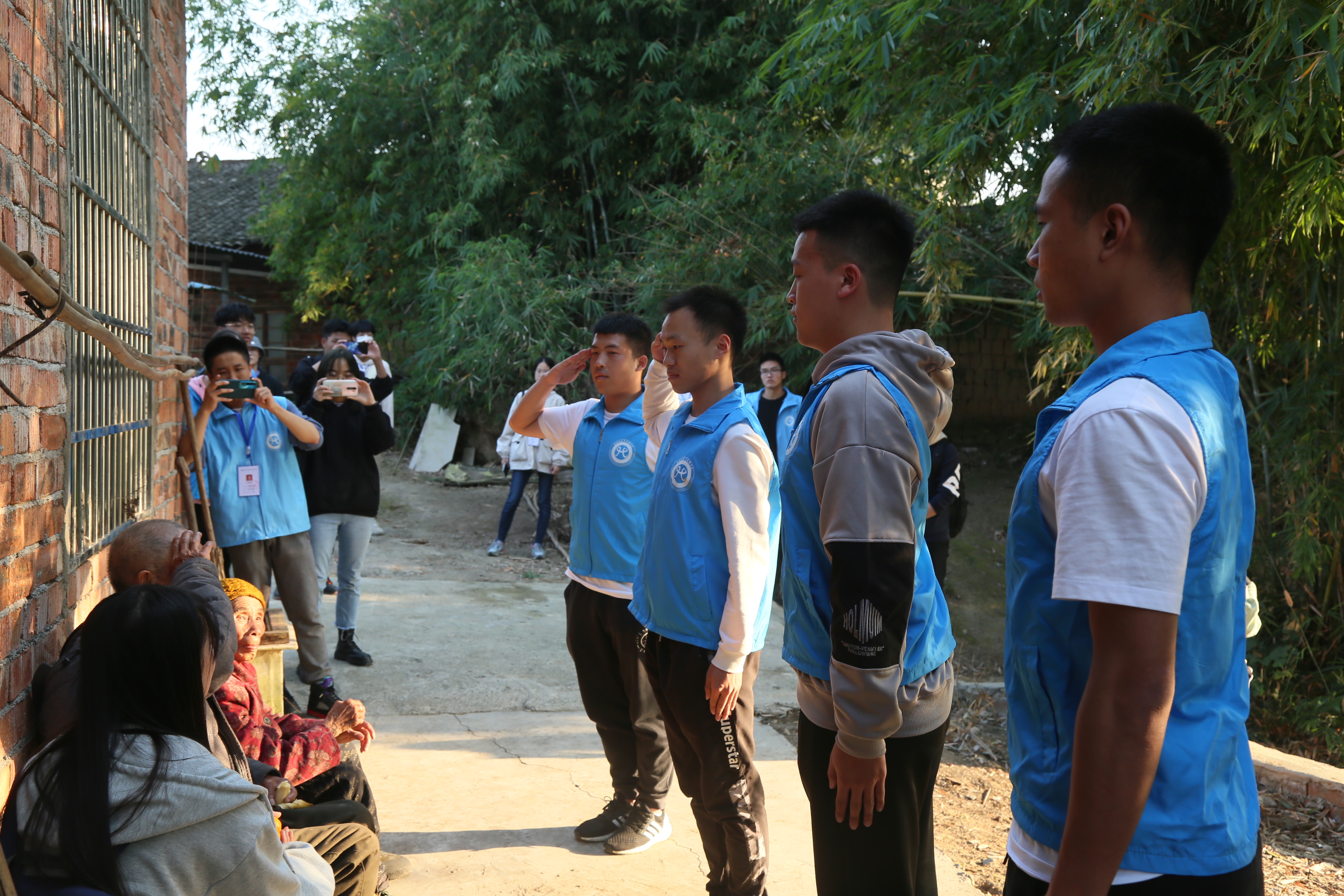 下午3时,志愿者们提着水果、八宝粥、糕点,来到孙志柏老人的家中,帮忙整理房屋和打扫卫生,聆听英雄故事。孙志柏老人14岁参军,曾参与抗日战争,抗美援朝战争,以自己的血肉之躯护祖国安宁,在与同学们回忆当年时,他不禁慷锵有力地唱起了红歌,虽已95岁高龄,但气势不减当年。我们退伍复学的4名志愿者带领全体为孙爷爷献唱《三大纪律八项注意》、《团结就是力量》、《歌唱祖国》等红歌,歌唱结束后用标准的敬礼表达了对英雄的崇高敬意。