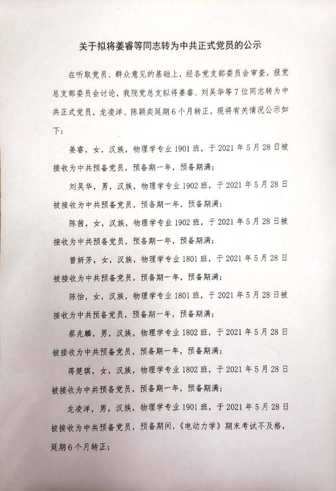 关于拟将姜睿等同志转为中共正式党员的公示