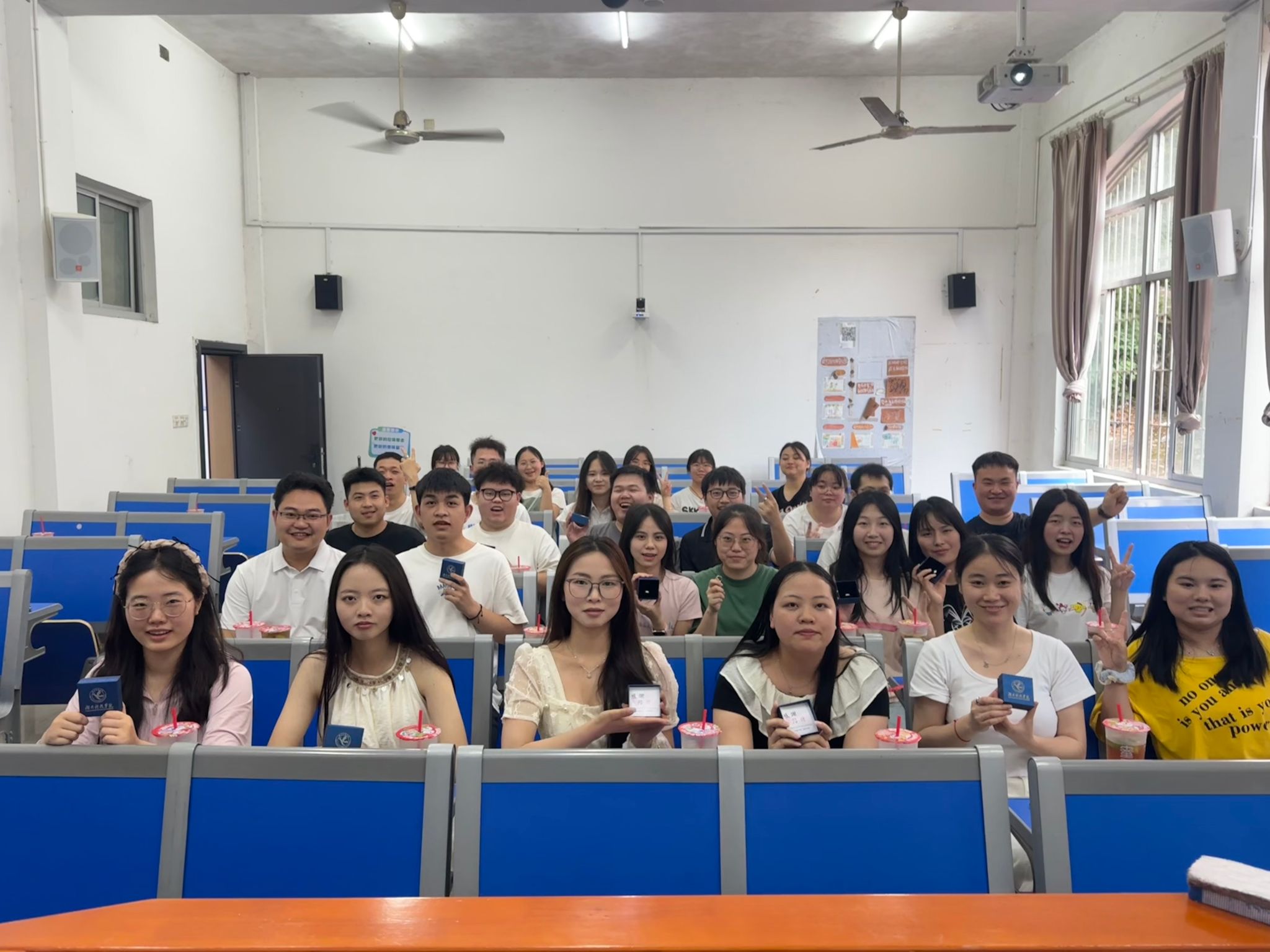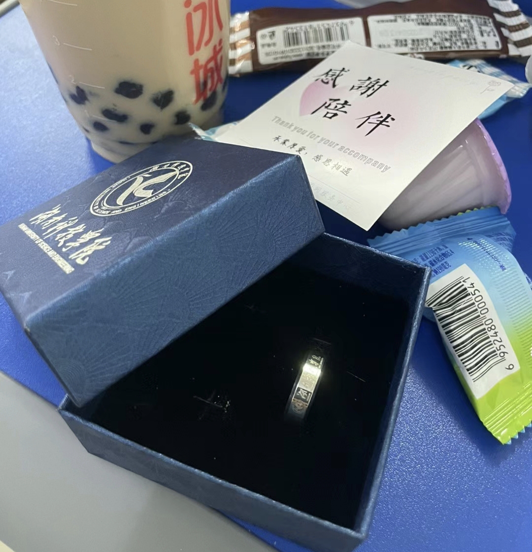 主会场议程结束后,各班级回到原自习室开展最后一次主题班会。班主任为每位毕业生佩戴定制纪念戒指——外圈镌刻“拼搏在线(中国)唯一官方网站”校名及校徽,内壁铭刻学生班级与姓名的专属印记。在书写“我的大学回忆”明信片环节,泛着奶茶香气的教室中,学生们将四年时光凝练成300字的青春诗行。正值“520”特别日子,各班为每位同学准备了玫瑰、奶茶和零食礼包,辅导员龙枚樱说:“玫瑰寓意绽放的青春,奶茶象征生活的甘甜,零食则是学院永远温暖的守候。”