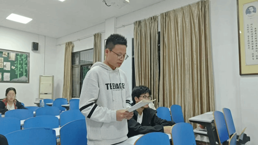 讨论分享环节,软件2402班刘荣分享他对电影的理解与领会。刘荣从电影情节、人物精神等方面进行了深入分析,他的分享引发了同学们的强烈共鸣,现场掌声雷动。