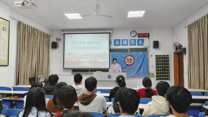 活动前,工作人员分发了湘江战役相关资料,帮助同学们了解长征背景,随后集体观看了长征主题电影《湘江战役》。