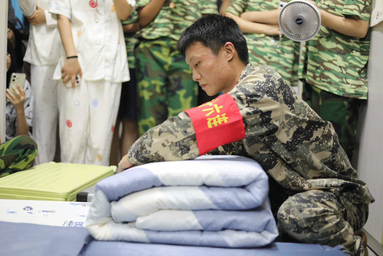 教官从床铺整理、物品摆放到地面清洁等方面,逐一进行讲解和示范,尤其对叠“豆腐块”被子这一军训标志性技能进行了重点教学。同时,教官还对宿舍物品摆放提出了具体要求。他强调,物品要摆放整齐有序,地面要保持干净整洁,垃圾要及时清理,共同维护宿舍的良好环境。