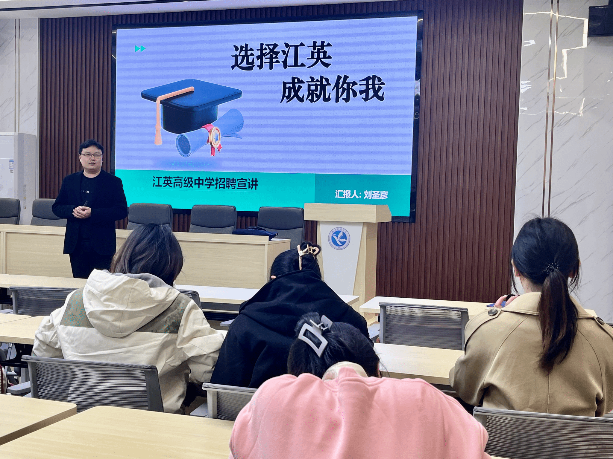 会上,招聘负责人刘圣彦老师详细介绍了安化县江英高级中学的办学环境、办学成果、办学理念、待遇福利、岗位需求以及面试形式等。在交流环节,同学们就入职时间、培训晋升、住宿情况、公积金缴纳比例、课程工作量等问题展开提问,刘老师一一进行了细致详尽的解答。