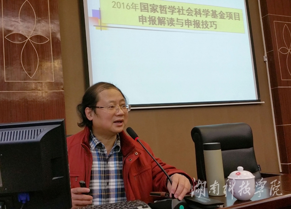 莫道才教授分享了其三次获得国家社科基金课题(重大项目1项,普通项目2项)的立项经验,为我校作2016年国家哲学社会科学基金项目申报指导。他指出,项目的选题要尽量与申报指南紧扣起来,要突出地方、民族、学科特点,要充分考虑课题组成员的前期成果,要有时代感,要贴近理论前沿,要有全国性意义,要与自己研究领域紧密相关。他还向大家传授了项目论证的技巧,并指出了申报书中常见的问题。他还就《2016年度国家社会科学基金项目申报公告》进行了深入解读。