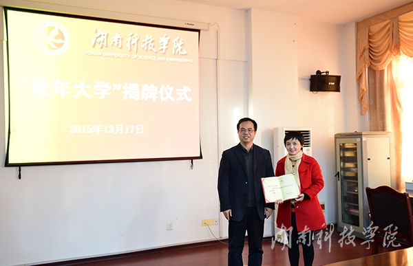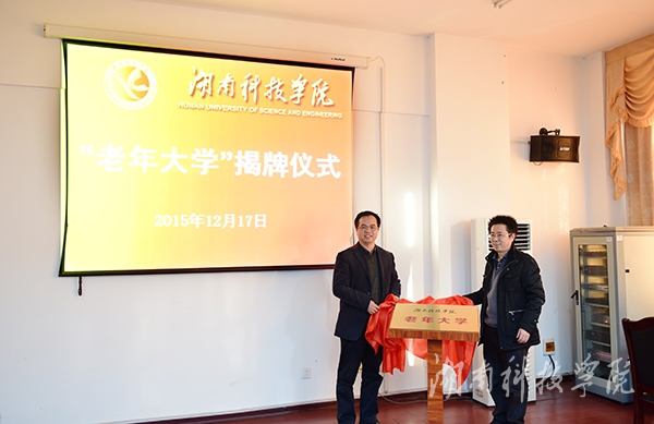 随后,陈弘、曾宝成共同为“老年大学”揭牌。曾宝成宣读“老年大学”校务委员会名单,刘剑非任主任,成玉兰任副主任,庄和美、唐基云、 石亚干、 李基顺、 蒋贵开为委员。“老年大学”由我校与永州市中心医院携手共办,将通过聘请客座教授的形式,开展医疗保健、音乐、书法、舞蹈等项目。