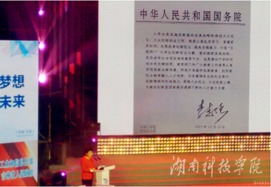 全国总决赛期间,同步举办了高校创新创业成果展(我校是湖南省推荐参加高校创新创业成果展三所高校之一)和“互联网+”产学合作协同育人报告会等活动,国务院副总理刘延东参观了高校创新创业教育成果展、出席了座谈会并发表重要讲话。
