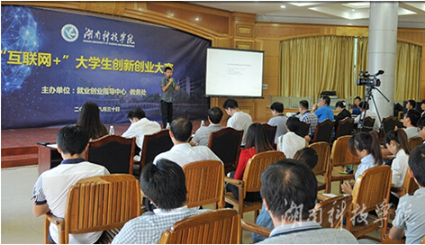许多学生是第一次参加这种大型比赛,没有足够的经验。于是就业创业指导中心采用线上、线下相结合的方式指导学生参赛。在线上,结合学生已放暑假离校的实际情况,建立“湘科院互联网+”QQ群,开通由清华大学朱恒源教授主讲的《创新创业》精品课程,并网络上收集其他创新创业相关的资料,组织有意向的学生在线学习。在线下,实行“派出去”(如外派老师参加SYB创业培训师资班等)又“请进来”(邀请企业家、天使投资人、校外专家等来校担任创业导师)的办法,壮大指导教师团队力量,遴选和重点指导参加全省复赛的种子项目。