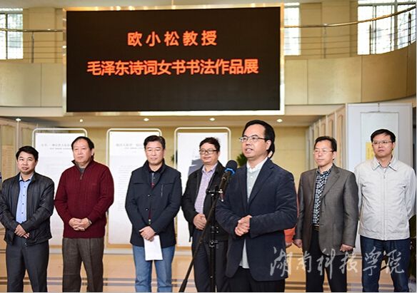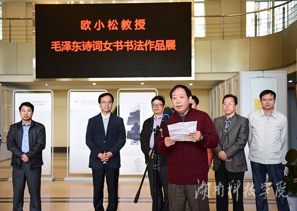 本次展出旨在推进地方优秀传统文化传承与创新,大力营造文化育人的浓厚氛围,由科技处、图书馆、宣传部、教务处、工会等单位主办,永州市开图文化传播有限公司承办。欧小松教授共精选了毛泽东诗词五十一首参与此次作品展,每幅都雍容华贵,精巧雅致。