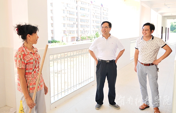 陈弘一行还实地查看了明德楼、东门停车场,就相关项目改造维修、校园绿化美化等工作提出了要求。陈弘充分肯定了基建处同志为提升广大师生幸福指数所做的大量工作,他勉励大家要不断改善和美化校园环境,为广大师生提供更加美丽的校园文化环境,塑造学校新气象。