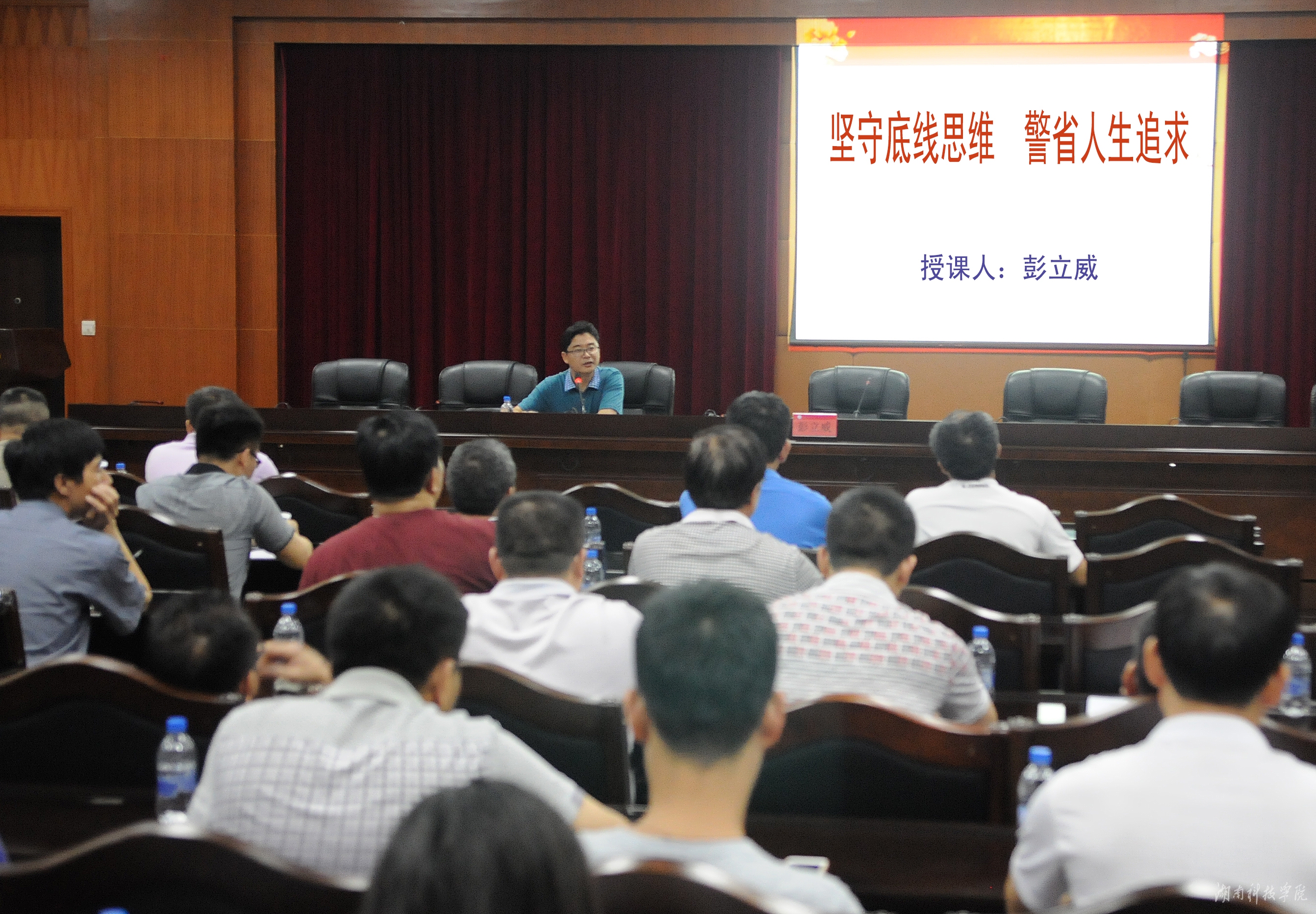 本网讯(记者 吴亚 摄影 秦峰)6月18日晚,我校基层党组织干部培训班第二讲在行政办公楼八楼会议室举行。校纪委书记彭立威作题为《坚守底线思维,警省人生追求》专题党课。各机关党总支委员以及全体处级干部参加培训。