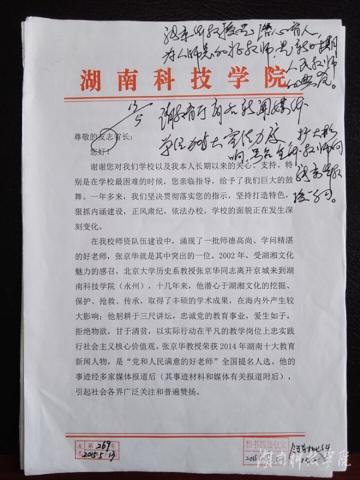 本网讯 湖南省人民政府副省长李友志十分关心我校教师队伍建设,要求我校努力打造名家名师。近日,李友志副省长就张京华教授先进事迹作出重要批示:张京华教授是潜心育人、为人师表的好教师,是新时期人民教师的典范。请教育厅商各新闻媒体单位加大宣传力度,扩大影响,号召全体教师向张京华教授学习。