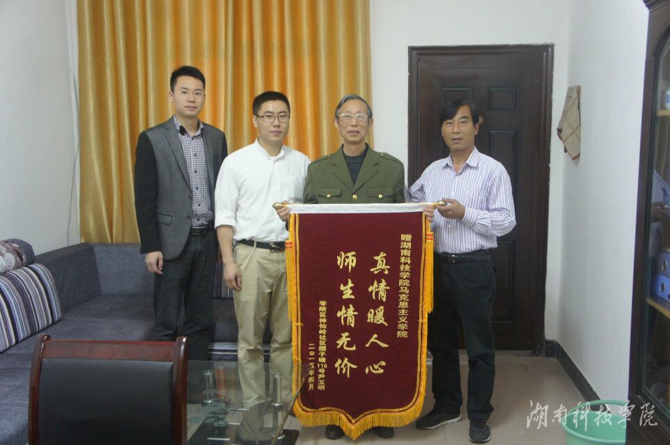 这天上午,零陵区七里店街道办事处神仙岭社区尹玉明老先生来到该院,给师生送来鲜红锦旗,表达对学院领导和全体师生的感激之情。66岁的老人尹玉明一家贫困不堪,儿子媳妇都是残疾人,因烧伤至今仍在治疗中,老两口因生病长年吃药,生活举步维艰。今年3月26日,该院志愿者组成爱心帮扶团又一次走进神仙岭社区献爱心,为尹玉明家送去生活物资和祝福。尹玉明老先生饱含热泪的说:“在我们最艰难的时刻,学院师生用真情和爱心鼓励我和家人振作起来战胜磨难。”