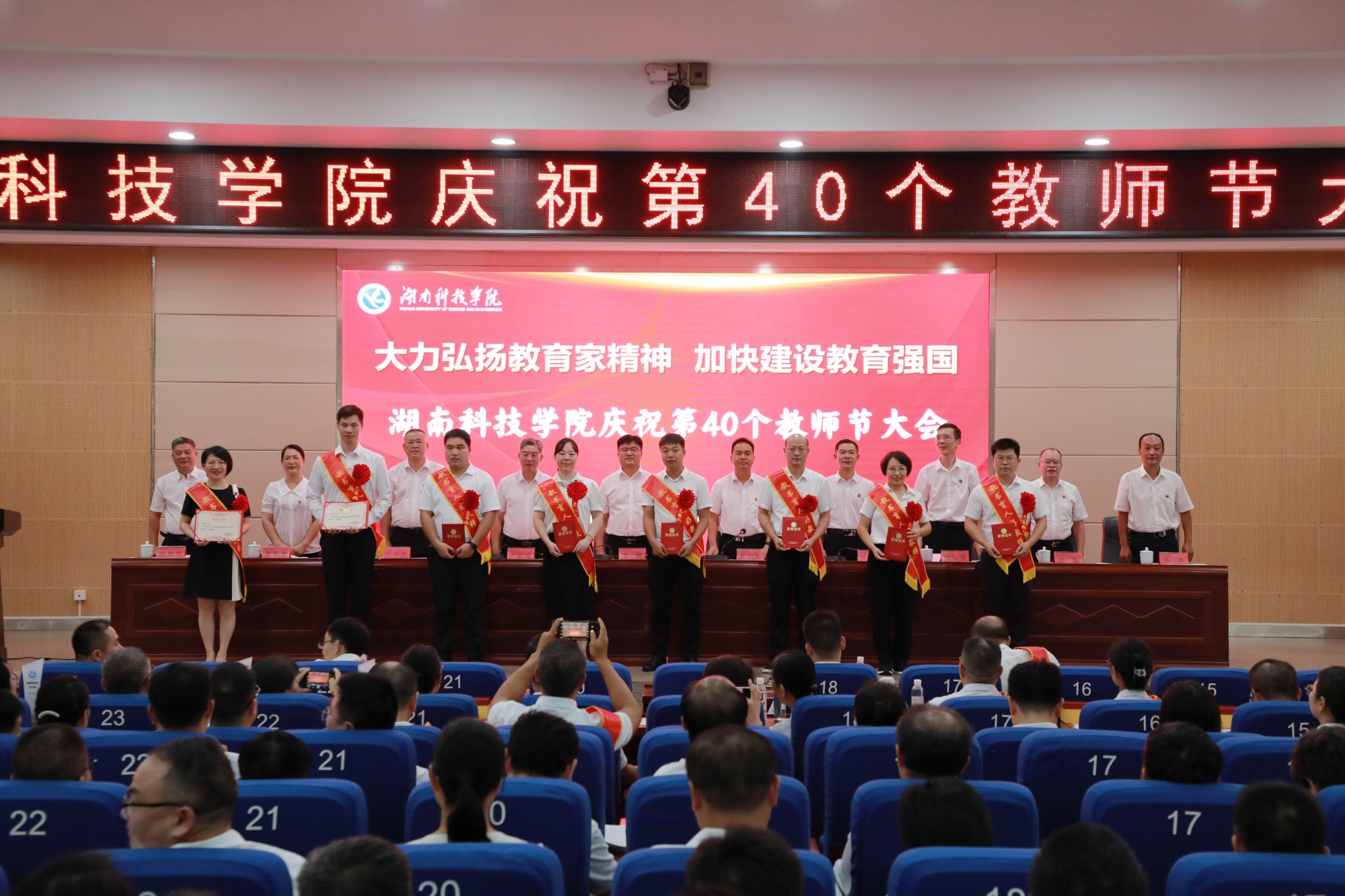 宋宏福宣读“奉献科院30年”教职工名单,吴小林宣读表彰决定。覃佐东获湖南省芙蓉学者特聘教授,周基获湖南省芙蓉学者青年学者,黄渊基获湖南省文化领军人才,廖阳获湖南省芙蓉教学名师,胡维获“永州市模范教师”,廖阳、廖海燕、田琼获“永州市优秀教师”,贡贵训获“永州市优秀教育工作者”,吴春江等12位教师获校“管理育人好干部”,陈红初等22位教师获校“教书育人好教师”。