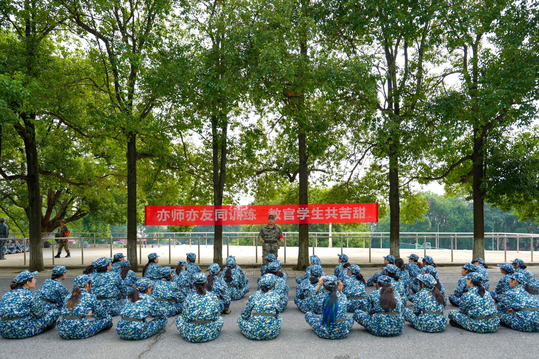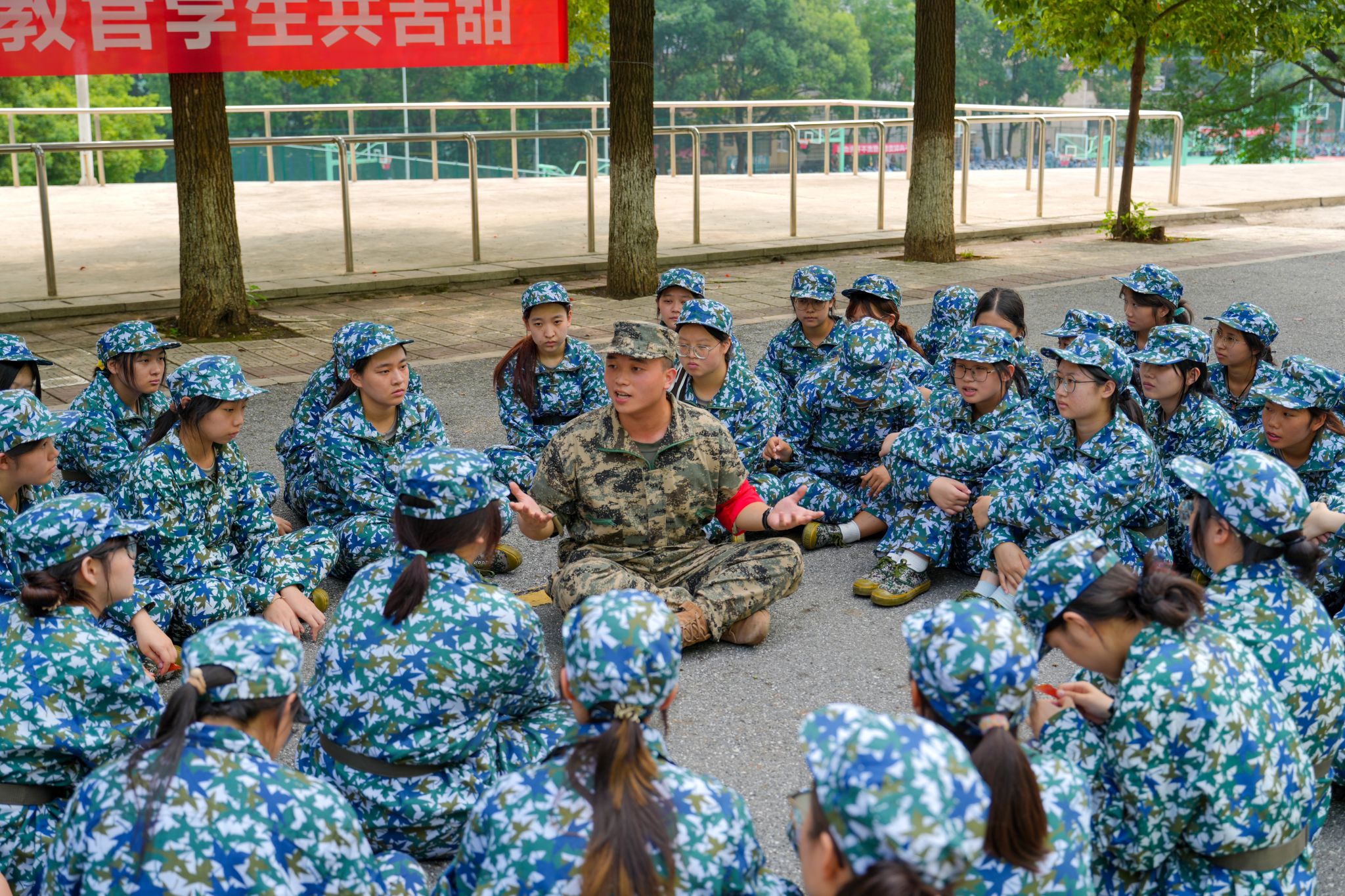 学生教官们在教导2024级新生进行军事训练之余,还结合自身军旅生涯传授国防知识,与同学们一起交流并思考军训的意义、价值和体会,帮助同学们厚植家国情怀、培养奋斗精神。学生们围着教官坐在一起,抢着回答教官问题,分享青年大学生的“大志向”和“大情怀”。