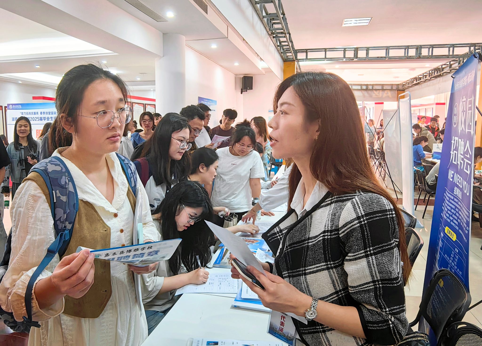 本网讯(记者 逄宇鸣 向玉珍 摄影 潘加 通讯员 张亚南)3月26日上午,学校2025届毕业生春季双选会在潇湘大讲堂举行,副校长郑银芳出席活动,各教学学院相关负责人、毕业班级辅导员以及2025届毕业生参加活动。