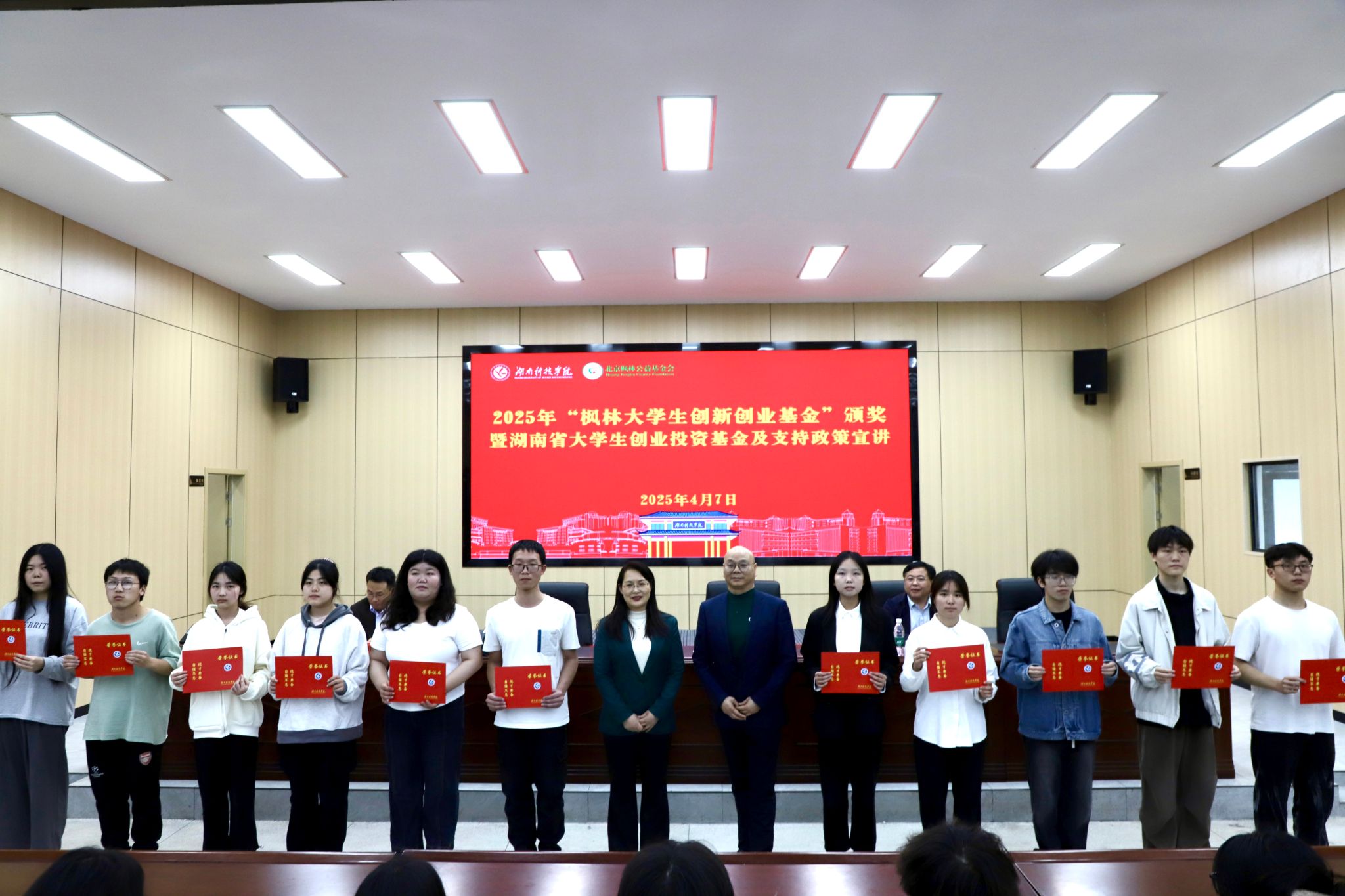 本网讯(记者 刘斌 唐晶 摄影 潘加)4月7日,2025年“枫林大学生创新创业基金”颁奖仪式暨湖南省大学生创业投资基金及支持政策宣讲活动在我校举行。我校77级校友、北京枫林公益基金会会长张亚红,副校长郑银芳出席活动,34个获基金资助的学生创业项目负责人、指导老师代表以及相关工作人员参加。
